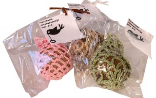 Ambachtelijke gemaakte mezenbolletjes in een gehaakt netje. Mezen en andere vogels zijn gek op deze vetbolletjes, het is een mooi gezicht om vogels te zien genieten van deze lekkernij. En met een beetje geluk treft misschien wel een specht aan die hiervan gaat genieten.