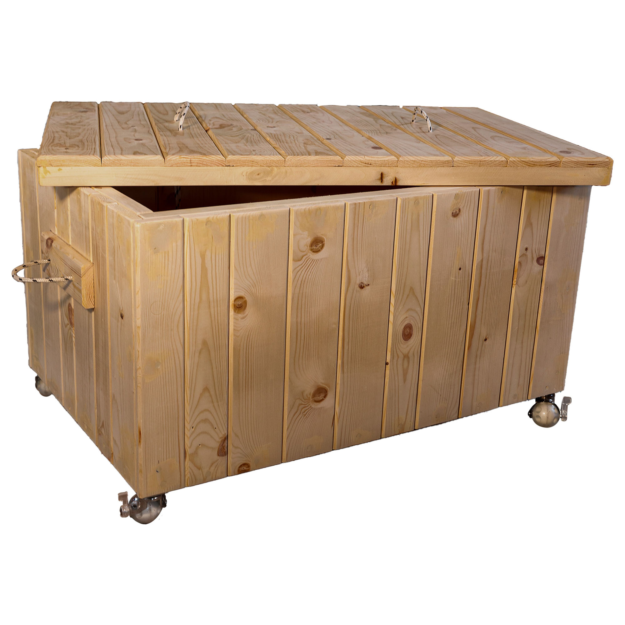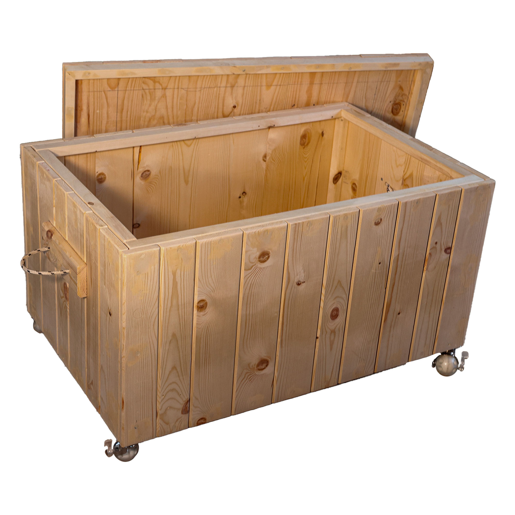 Deze mooie handgemaakte houten speelgoedkist is gemaakt van resthout. Aan de onderkant van de opbergkist zitten kunststoffen swing wieltjes waardoor het verplaatsen erg makkelijk gaat. Houten speelgoedkisten wordt gemaakt van resthout daarom kan het materiaal variëren van vuren, grenen etc.